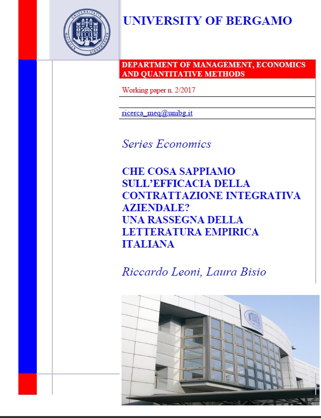 | 1-gen-2017 | Che cosa sappiamo sull'efficacia della contrattazione integrativa aziendale? Una rassegna della letteratura empirica italiana | Leoni, Riccardo; Bisio, Laura | Working paper del Dipartimento di Scienze aziendali, economiche e metodi quantitativi::WPs MEQ - Economics Series (2013-2017) | |