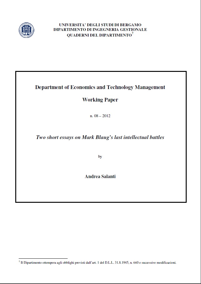 | 1-gen-2012 | Two short essays on Mark Blaug’s last intellectual battles | Salanti, Andrea Giuseppe | Working paper del Dipartimento di Ingegneria gestionale, dell'informazione e della produzione::WPs - Dep. of Economics and Technology Management (2004-2012) | |